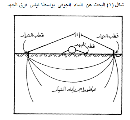 يقاس فرق الجهد او الفولتية بواسطة قطبين منفصلين موضوعين بالتناسق والتماثل على الخط الواقع بين اقطاب التيار (شكل 1)، وتتكون الشبكة ذات الاقواس الدائرية من خطوط جريان التيار وخطوط الجهد المتساوية، وهي تحكم قياسات فرق الجهد والتيار فوق المنطقة تحت السطحية. لذا تعطي هذه القياسات مقاومة ظاهرية خلال عمق غير محدد. فكلما ازدادت المسافة بين الأقطاب كلما زاد عمق المجال الكهربائي واختلفت المقاومة الظاهرية.