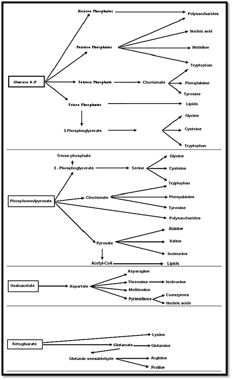 وتمثل هذا الكلوكوز المفسفر ومركب Phosphoenol pyruvate ومركب Oxaloacetate و α –ketoglutarate ويمكن تقسيم العمليات الايضية في الاحياء المجهرية الى :