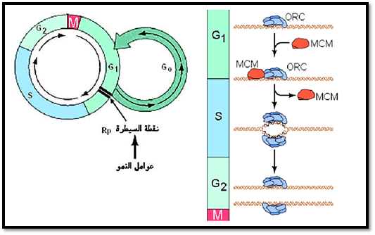 ولضمان ان تضاعف DNA يحدث مرة واحدة لكل دورة خلية فهناك مجموعة من البروتينات وهي MCM proteins التي ترتبط الى مناطق اصل تضاعف الكروموسومات وتكون معقدات مع (ORC) Origin replication complex كما موضح في الشكل (3).