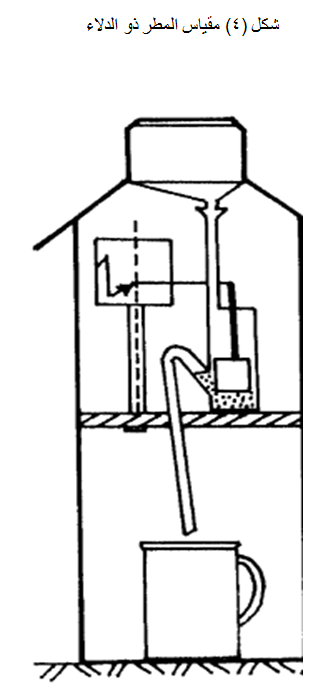وبعضها يعبر عن كمية التساقط بارتفاع وانخفاض عوامة تطفو فوق المياه التي تتجمع داخل مستودع محدود السعة floot –type gauges، يمكنه التخلص من الكميات الزائدة، اما بصرفها خارج الجهاز او جمعها أيضا بمستودع اكبر. وترتبط العوامة بمؤشر، بحدد مسار تساقط الامطار على ورقة رسم بيانية كما هو الحال في الجهاز السابق. وتعتمد بعض دوائر الأرصاد الجوية مقياس المطر ذو الدلاء tipping buckest gauge، الذي يتكون من دلوين صغيرين يتسع الواحد منهما لـ0.25 ملم من الامطار. وكلما امتلا دلو يبدا الاخر بالامتلاء، بعد ان يبدا الأول بتفريغ ما بحوزته، ويوجد مؤشر خاص يسجل على ورقة رسم بيانية دوارة عدد المرات التي تم تفريغ تلك الدلاء، وبعملية حسابية بسيطة نستطيع حساب كمية الامطار الساقطة (شكل 4).