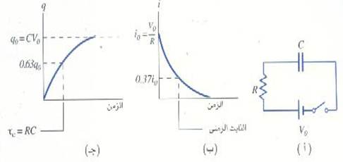 حيث/R i0 = V0 وحاصل ضرب RC له وحدات زمن يسمى الثابت الزمني السعويTc.(تأكد من أنك تستطيع إثبات أن.F = s Ω). عند اللحظة t = Tc فالتيار يصل إلى (1/c2) = 0.135 من قيمته i0 ، وهكذا.