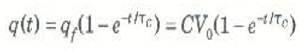 ويظل المكثف يتلقى شحنات طالما كان هناك تيار يمر في الدائرة. وعندما يتوقف التيار في النهاية، فإن معنى ذلك أن الجهد عبر المكثف قد أصبح مساوياً لجهد البطارية، أو VC = qf /C = V0 ، حيث qf هي الشحنة النهائية على المكثف. وتغير الشحنة على المكثف مع الزمن يمكن تمثيله بيانياً بالشكل ( 1جـ) أما الصيغة الرياضية لهذا الرسم البياني فهي: