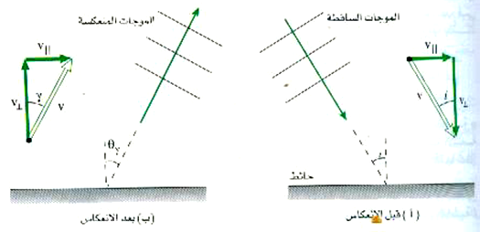 افترض أن موجات مائية مستوية تسقط على حائط مسطح كما يبين الشكل (3 أ) ويمن تحليل سرعة الموجة القادمة إلى مركبتين، إحداهما v┴ متعامدة على الحائط والأخرى v|| موازية له. وعند الارتطام بالحائط فإن v┴ تعكس اتجاهها بينما يظل اتجاه v|| بدون تغيير. . ونتيجة لهذا تنعكس الموجة من السطح . . ويوضح الشكل (3 ب) الشعاع المنعكس ومركبتي سرعته. وسنحاول الآن معرفة العلاقة بين زاوية السقوط iθ المبينة في الجزء (أ) وزاوية الانعكاس rθ المبينة في الجزء(ب).