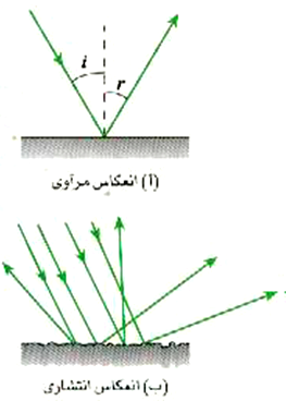 ويسمى ذلك النوع من الانعكاس المبين في الشكل (4 أ) ، حيث يكون السطح العاكس أملس تماماًكما في حالة المرآة: انعكاساً مرآوياً. أما الأسطح الخشنة مثل الورق أو الجدران المطلية فإنها تؤدي إلى انعكاس انتشاري كالمبين في الشكل (4 ب). وعلى الرغم من أن قانون الانعكاس ينطبق بالنسبة لهذه الأسطح على أشعة منفردة في الحزمة الضوئية إلا أن الأسطح غير الملساء تجعل الأشعة تنعكس بزوايا مختلفة من على المستوى المتوسط للسطح.