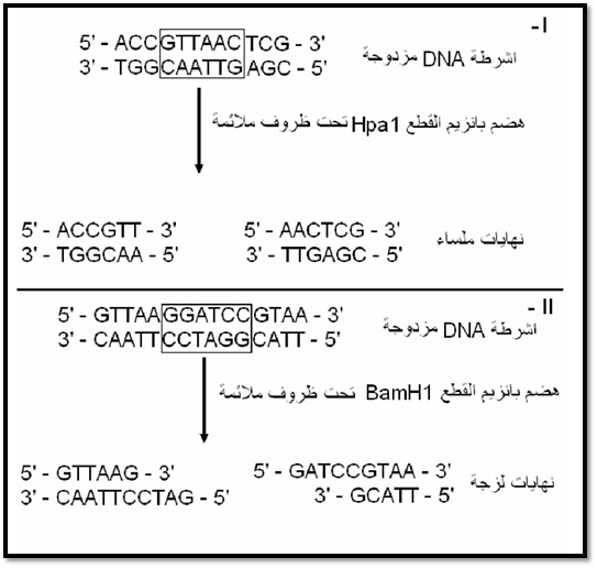 وعليه فان الانزيمات تختلف بشكل كبير في توالي الموقع التي تتعرف عليها اضافة الى اختلافها في المواقع التي تفلقها، فالبعض تقص الشريطين في الموقع نفسه مؤدية الى انتاج نهايات ملساء للقطع الناتجة (Blunt restriction fragments) ، في حين ان انزيمات اخرى تقطع احد الاشرطة في موقع والشريط الاخر في موقع آخر مؤدية الى انتاج قطع بنهايات لزجة Sticky ends كما موضح في الشكل الآتي (شكل 1)