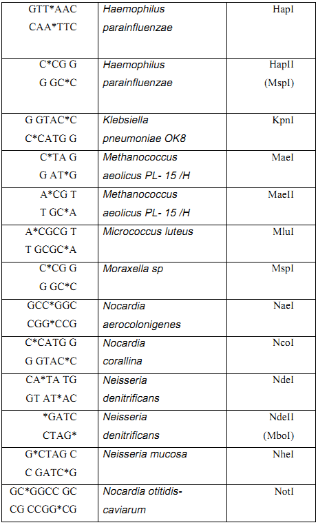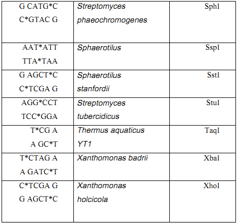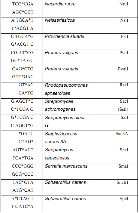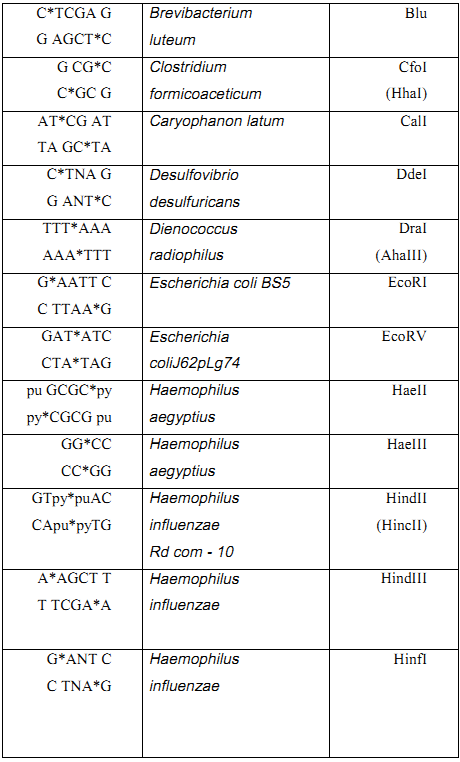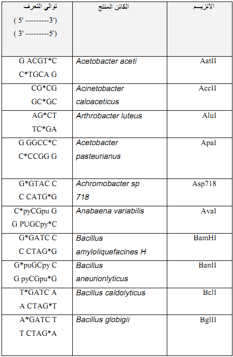 وأهم الانزيمات القاطعة المستعملة في الهندسة الوراثية موضحة في الجدول (1)