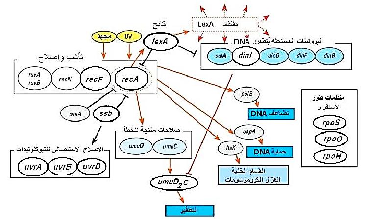 2- عملية اصلاح تتجاهل قاعدة ازدواج القواعد المعروفة في اشرطة DNA وهذه تسمى التصحيح المولد للأخطاء (Translesion DNA synthesis) Error –porne repair وقد تؤدي الى حصول على شفرات غير حساسة Non sense codon وانتاج بروتين غير فعال نتيجة لوجود حامض او حوامض امينية بشكل خاطئ. ويحوي النظام على جينات اخرى كما موضح في الشكل، هي sulB و SulA التي تنشط وتعمل على منع انقسام الخلايا لإعطاء وقت كافي لإصلاح الضرر في DNA قبل بدء التضاعف. وحدوث الطفرات بعد عمل نظام الاستغاثة يعود الى سرعة عمليات التضاعف وقلة قابلية وفعالية Proof reading، ولكن مع هذا يلاحظ ان الخلايا التي لا تحوي على نظام الاستغاثة او كونه معطلا بالطفرات فان الخلايا تموت عند تعرضها للعوامل المدمرة لموادها الوراثية.