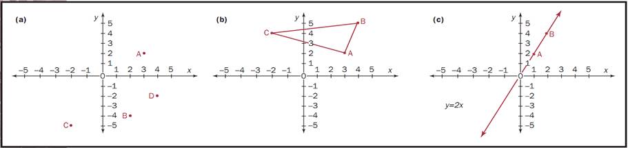 satisfy a specific equation. The line in (c) may be expressed as y= 2x. The coordinates of every point on the line will satisfy the equation y = 2x, as for example, point A (1, 2) and point B (2, 4). More complex equations are used to represent circles, ellipses, and curved lines.