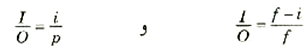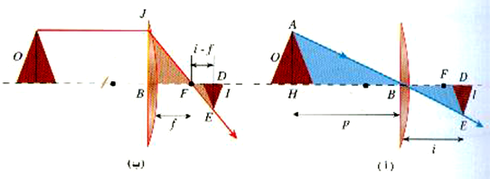 وقد استخدمنا نفس الرموز لعد الجسم وبعد الصورة مثلما فعلنا في حالة المرايا. ومن المثلثين المتشابهين JFB و EDF في الجزء (ب) نحصل على :
