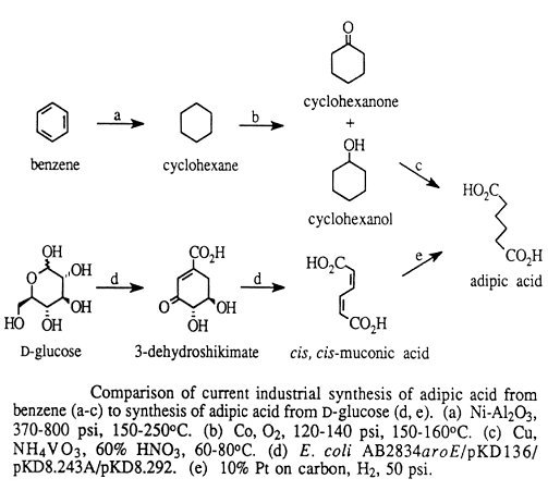 ويستخدم فى الخطوة (d) عامل مساعد بيولوجى لتحويل D-glucose إلى Cis- muconic acid ثم تتم فى الخطوة (e) عملية هدرجه الحامض الأخير متحولا إلى حمض الاديبيك .