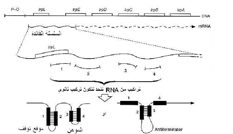 3- التوهين Attenuation احدى الاليات التي تنظم بها الاوبرونات وذلك بأنهاء عملية الانتساخ وتنتج جزيئات mRNA غير كاملة او ناضجة وتستعمل بكثرة في الاوبرونات العالمة في مسارات التخليق خاصة عندما تصبح الخلايا غير محتاجة لنواتجه، فعند وجود المادة بكثرة تكبح عملية بدء تكوين النسخ التي بدأت من الممهدات عادة وتنتهي قبل ان يحصل انتساخ كامل للجينات التركيبية، وتزداد هذه فعالية الآلية بزيادة تركيز النواتج عن الحد اللازم الذي تحتاجه الخلايا. وفي هذه الالية يلعب التركيب الثانوي لجزيئة mRNA الدور الأساسي، فجزيئات mRNA تحوي على سلسلة او توالي قائد Leader sequence تقع بين بداية نقطة الانتساخ وبداية الجينات التركيبية. وتكون جزيئات mRNA العاملة في الاوبرونات التي تنظم التوهين ذات صفات معينة فمنطقة السلسلة القائدة يمكن ان تكون تركيب ثانوي، وتكون مميزة الى اربعة مناطق يمكن ان تزدوج مع بعضها كما موضح في الشكل (1) للأوبرون التربتوفان.