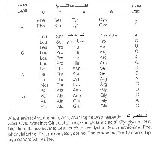 تنتظم القواعد النتروجينية لتكون الشفرات الوراثية التي تحدد بدورها الحوامض الامينية التي تترجم فيما بعد في السلاسل البيبتدية والبروتينات. ونظراً لوجود 5 قواعد نتروجينيه فان الشفرة الوراثية المكونة من قاعدة واحدة لا تكفي للتشفير لحوالي 20 حامض أميني، وكذلك وجود قاعدتين للشفرة الوراثية أيضاً لا يكفي وذلك لان 42=16 وهي اقل من عدد الحوامض الأمينية، ولكن عندما تكون الشفرة الوراثية مكونة من ثلاثة قواعد نتروجينيه (43) يعني وجود 64 شفرة وراثية، وهذا ممكنا وذلك لوجود ثلاثة شفرات هي شفرات ختم او إنهاء TAA، TAG، TGA والتي يقابلها UAA، UAG ، UGA على RNA. اما الشفرات الباقية فتكون الشفرات الثلاثية للحوامض الامينية التي يشفر لبعضها بأكثر من شفرة واحدة ولذلك تسمى هذه الشفرات بالمشتتة Degenerate codons. وباستثناء الحامض الأميني الميثايونين والتربتوفان فيشفر لكل منها بشفرة واحدة وهي موضحة بالجدول الآتي (جدول 1).