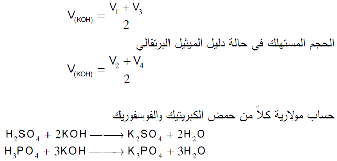 عند استخدام دليل الميثيل البرتقالي نجد أن حجم هيدروكسيد البوتاسيوم المستهلك من السحاحة يكافئ كل الكبريتيك وثلث الفوسفوريك ومعادلات التفاعل في هذه المرحلة توضح ذلك:
