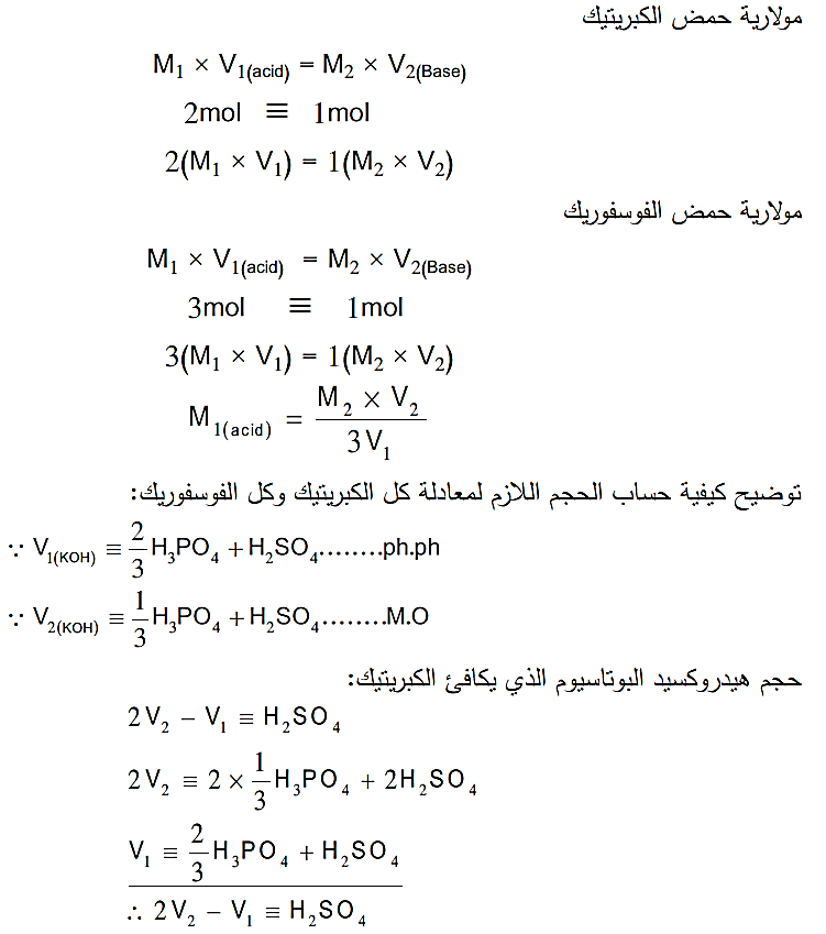 من معدلات التفاعل نجد أن 2 مول من هيدروكسيد البوتاسيوم تكافئ 1مول من حمض الكبريتيك و 3 مول من هيدروكسيد البوتاسيوم تكافئ 1مول من حمض الفوسفوريك،ولكي نستطيع حساب مولارية كلاً من الحمضين لابد أن يتساوى عدد مللي مولات الحمض مع عدد مللي مولات القاعدة.