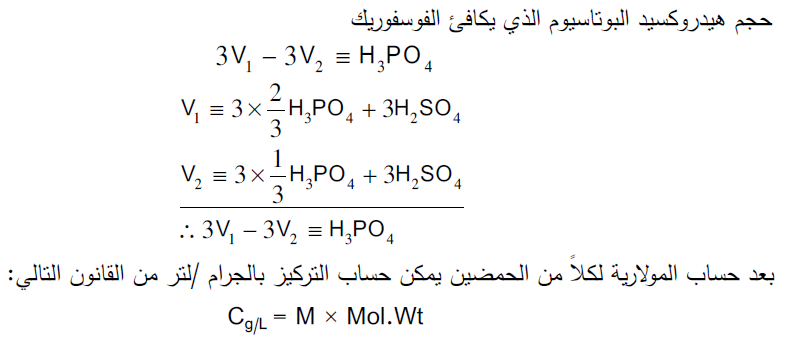 تعيين مولارية كلاً من حمض البكرتيتك و حمض الفوسفوريك والتركيز بالجرام/ لتر والوحدات الاخرى وتتم المعايرة بأستخدام دليلين (دليل الفينول فثالين ودليل الميثيل البرتقالي)وهذه المعايرة تتم على مرحلتين
