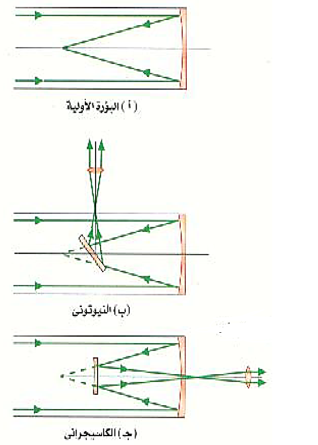 إذا كانت المرايا تعكس الضوء ليرتد على طول محور التليسكوب، فقد ابتكر الفلكيون طرقاً عديدة لتوجيه الضوء بواسطة عواكس نحو البقعة المناسبة. ويوضح الشكل 3)) بعضاً من هذه الطرق. ويستوعب أكبر التليسكوبات اجهزة كثيرة بل ويستوعب حتى الفلكي نفسه عند بؤرة العدسة الشيئية تماماً (وهي المسماة بالبؤرة الأولية) داخل التليسكوب كما في الشكل (3 أ).