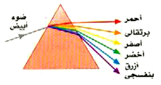 الشكل 2)): ليست زاوية الانحراف بواسطة المنشور ثابتة لجميع الأطوال الموجية التي يحتويها الضوء ولذلك يفرق المنشور الضوء الأبيض إلى الألوان المكونة له.