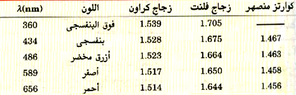 الجدول ((1: تغير معامل الانكسار مع الطول الموجي (التفريق) بالنسبة للزجاج والكوارتز.