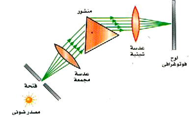 الشكل 3)): تتكون صورة للفتحة على اللوح الفوتوغرافي للمطياف ذو المنشور. فإذا كان الضوء يحتوي على أكثر من طول موجي واحد، فإن صوراً عديدة ستظهر على اللوح الفوتوغرافي.