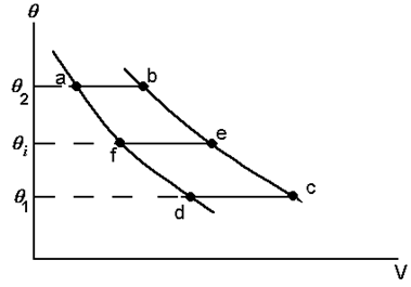 الشكل 1: دورات كارنويَّة في المستوى q-V، يُمثِّل كُلٌّ من المنحنى a-f-d و المنحنى b-e-c عمليَّة أدياباتيَّة منعكسة