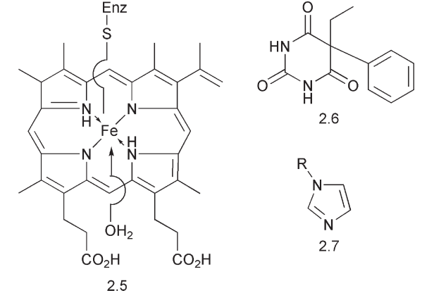 Some cytochrome P450s in the liver are induced by specific drugs, e.g. phenobarbital 2.6 while others may be inhibited by drugs, e.g. by azoles 2.7, which complex with iron. For example, the anti-ulcer drug, cimetidine, which contains an imidazole ring, binds to the iron of cytochrome P450s. This alters the metabolism and hence biological activity of other drugs. Ethanol and a constituent of grapefruit juice, nootkatone, also have an effect on cytochrome P450s. This can lead to an altered pattern of drug metabolism and to drug:drug interactions.