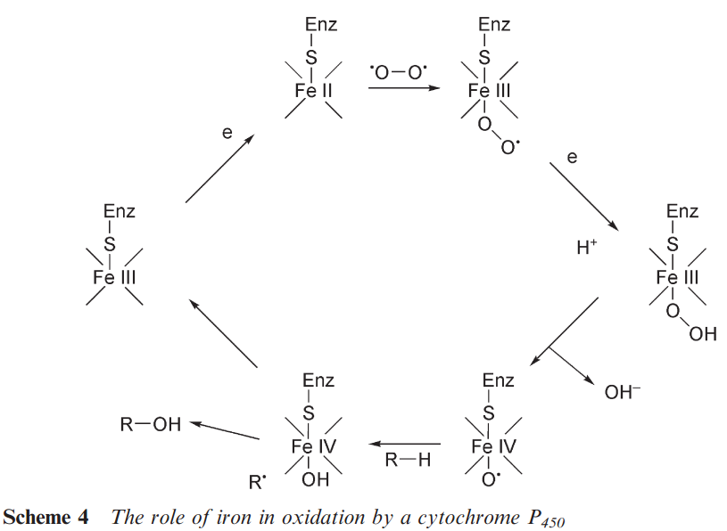 There are a variety of oxidative changes that may occur to a drug. Many of these involve the insertion of oxygen using a cytochrome P450-dependent enzyme. The cytochromes contain haem 2.5 as the co-enzyme. The oxygen is bound by the central iron and delivered to the substrate by a series of redox changes (see Scheme 4). There are a series of different cytochromes, CYP1A1, CYP1A2, CYP2A6, CYP2C9, CYP2C10, CYP2C18, CYP3A, CYP4A4 etc. in the liver. The cytochrome CYP3A4 is responsible for the oxidation of many drugs. Each of these, while containing the haem co-enzyme, has a range of different substrate specificities, hence the name ‘mixed function oxidases’. The relative proportion of these enzymes can differ between individuals and thus there are variations in the metabolism of drugs. Some individuals may lack a particular cytochrome. Consequently, toxic metabolites may only become apparent after a drug has been in use with a large number of patients.