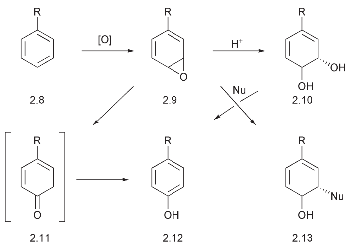 Many drugs contain an aromatic ring 2.8. Oxidation of the aromatic ring by the cytochrome P450s leads to the formation of a highly reactive, strained arene oxide 2.9. In the presence of acid, the epoxide undergoes hydrolysis to a diol 2.10, which may then be dehydrated to generate the aromatic ring of a phenol 2.12. Alternatively, a rearrangement may occur with the formation of a ketone 2.11 and thence by enolization, a phenol 2.12. The rearrangement of a hydrogen atom implicit in this process is known as the NIH shift after the National Institute of Health (USA) where it was discovered. The nucleophile in the cleavage of the epoxide may be the nitrogen of a nucleic acid base or the side chain amino group of a protein. The effect of this new bond is to attach the drug to the nucleic acid 2.13 or protein. This can lead to liver damage (hepatotoxicity). The nucleophile may also be the thiol of glutathione 2.4. This can lead to deactivation of a toxic metabolite.