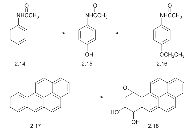 There are many examples of this step. Acetanilide 2.14 is a weak painkiller (analgesic), but it is converted by the liver to paracetamol 2.15, a more powerful analgesic. This is an example of a pro-drug:drug relationship. The aromatic hydrocarbon, benzopyrene 2.17 is converted to the carcinogenic 3,4-epoxy-7,8-dihydroxybenzopyrene 2.18.