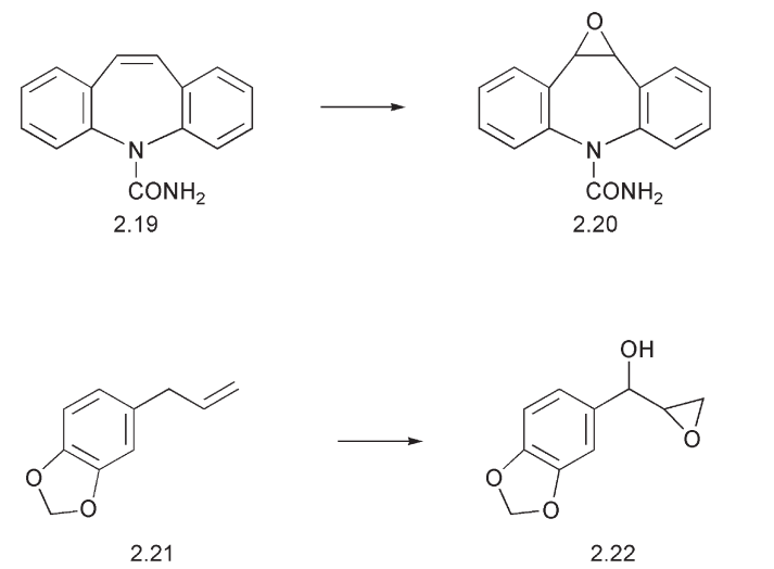 Nucleic acid bases such as guanosine react with the epoxide ring in 2.18. The aromatic ring of phenobarbital 2.6 may be hydroxylated. The benzylic position adjacent to an aromatic ring is also hydroxylated quite easily. An alkene may be epoxidized by the same process as exemplified by the metabolism of the tricyclic anti-depressant carbamazapine 2.19 to the epoxide 2.20. A combination of benzylic hydroxylation and epoxidation can be found in the metabolism of safrole 2.21 to the toxic hydroxy epoxide 2.22.