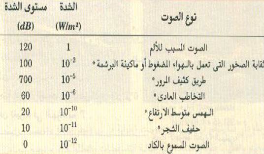 ووحدات شدة الصوت في النظام SI هي الواط لك متر مربع، ويوضح الجدول (1) شدة بعض الأصوات المألوفة مقدرة بهذه الوحدة. لاحظ أن مدى شدة الصوت الذي تستطيع الأذن أن تسمعه واسع جداً ،وهذا يبين أن الاذن جهاز قياس صوتي مذهل الحساسية.