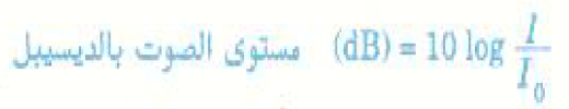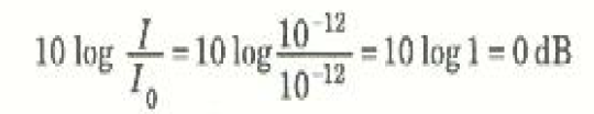 حيث I هي شدة الصوت المعطى ( بالواط لكل متر مربع) ،I0، هي غالباً ، وليس دائماً ، أقل شدة للصوت الذي تسمعه الأذن بالكاد وتساوي 10-12 W/m2. لاحظ أن مستوى شدة أقل صوت مسموع هي :