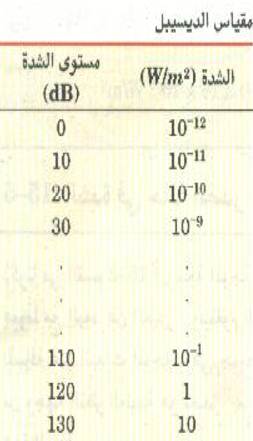 أي ان هذا المقياس يضغط رتب العظم الأثنى عشر لشدة الصوت المسموع إلى مقباس يمتد من 0 إلى 120 dB فقط. وبينما يبين الجدول ((1 قيم dB لمختلف مصادر الصوت التي نقابها في حياتنا، يبين الجدول (2) قيم dB المناظرة لقيم مختلفة من الشدة.