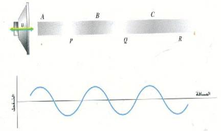 الشكل (2): تتكون الموجة الصوتية المنبعثة من المجهار من مناطق ذات ضغط مرتفع وأخرى ذات ضغط منخفض على التوالي. وعملياً يتغير الضغط في هذه المناطق بما يعادل 0.01 في المائة فقط أو أقل.