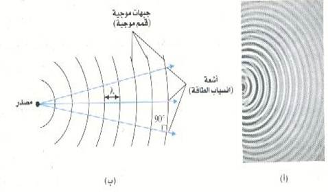 من المشاهد أن الموجات الصوتية المنبعثة من مجهار او أي مصدر صوتي آخر لا تتقيد عادة بالسير في خط مستقيم في اتجاه واحد فقط، ولكنها بدلاً من ذلك تنتشر من المصدر في جميع الاتجاهات. ولفهم هذه السمة من سمات الحركة الموجية يمكننا الرجوع إلى الشكل 3) ب). وكما نرى من هذا الشكل فإن القمم الموجية (وتسمى هنا بالجبهات الموجية) تكون على هيئة دوائر يزداد نصف قطرها زيادة مطرد أثناء حركتها مبتعدة عن المصدر. وعندما تصل القمم الموجية إلى مسافات كبيرة جداً بالنسبة إلى المصدر سوف تصبح هذه الدوائر كبيرة جداً ويكون انحناؤها صغيراً جداً ومن ثم فإذا نظرنا إلى قمم موجبة تقع على بعد كبير جداً من المصدر فإنها ستبدو على هيئة خط مستقيم تقريباً أثناء مرورها على سطح الماء. وبناء على ذلك تسمى الموجات البعيدة عن مصدرها بالموجات المستوية، وهو مصطلح موجي عام ينطبق أيضاً على الموجات ثلاثية الأبعاد كما سنرى حالاً.