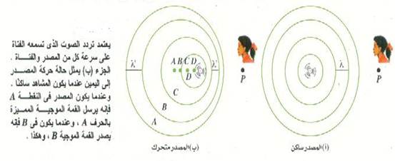 وتحدث ظاهرة مشابهة لذلك في حالة الموجات الصوتية، وهذا ما يمكن أن نراه بالشكل (2). فإذا كان المصدر ساكناً وكان المشاهد ساكناً أيضاً عن النقطة P سوف تسمع الأذن تردداً مماثلاً تماماً لتردد المصدر f، وهذا موضح بالشكل (2 ب). أما الشكل 2) ب) فإنه يوضح ما يحدث عندما يكون المصدر متحركاً والمشاهد ساكناً. في هذه الحالة سوف تسبب حركة المصدر اختلاف الطول الموجي للموجات المنبعثة منه في الاتجاهات المختلفة. ونظراً لأن حركة المصدر لا تؤثر على السرعة الموجية فغن تغير الطول الموجي سوف يؤدي إلى تغير تردد الصوت الذي يسمعه المشاهد الساكن. وبناء على التحليل السابق يمكننا أن نرى بسهولة أنه إذا كان المصدر متحركاً تجاه المشاهد فإن تردد الصوت المسموع سيكون اكبر من f؛ وإذا كان المصدر متحركاً مبتعداً عن المشاهد سيكون التردد المسموع أصغر من f ويختلف الموقف عندما يكون المشاهد متحركاً بالنسبة إلى مصدر ساكن، كما هو مبين بالشكل(3). فإذا كان المشاهد متحركاً تجاه المصدر فإنه سوف يستقبل عدداً من الجبهات الموجية كل ثانية أكبر من العدد المنبعث بالفعل من المصدر خلال نفس الزمن، أي أن المشاهد سوف يسمع تردداً أعلى من f. وبالمثل، عندما يتحرك المشاهد مبتعداً عن المصدر سوف تستقبل أذنه عدداً أقل من الجبهات الموجية في الثانية الواحدة، وبذلك سوف يقيس المشاهد تردداً أقل من f.
