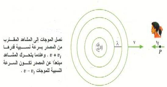 حيث vsسرعة المصدر. وبالمثل، عندما يكون المصدر مبتعداً عن المشاهد بسرعة قدرها vs سوف تستطيل المسافة بين كل قمتين موجبتين متتاليتين بمقدار vs T ،وهذا يعطي: