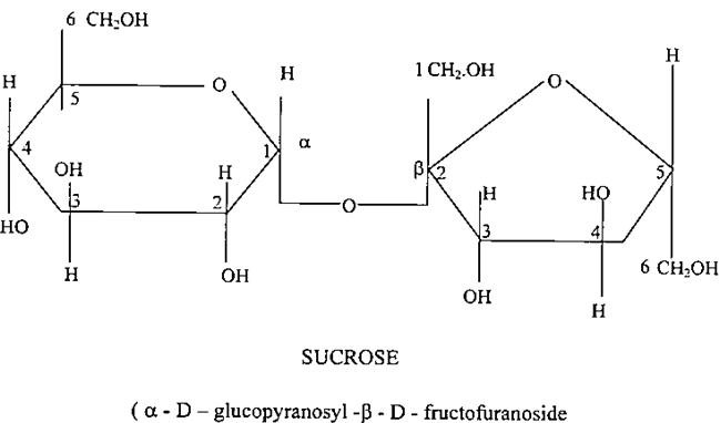 يتكون السكروز من جزيئة واحدة من ألفا D- كلوكوز مرتبطة بجزيئة من B – D فركتوز، حيث تتشكل الرابطة الكلوكوسيدية بين المجاميع المختزلة في كل من السكريين الاحاديين الكلوكوز والفركتوز بواسطة رباط أوكسجيني، وكما هو موضح في الشكل بطريقة هوارث (Haworth).