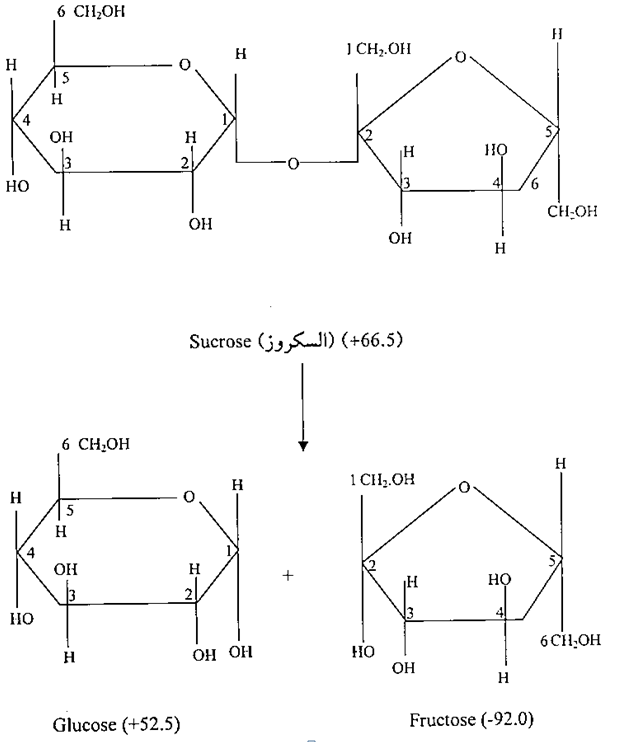 تتضمن عملية تفكك السكروز بواسطة حامض أو انزيم الانفرتيز (Invertase) تحول تركيب الفركتوز من الشكل الخماسي – فيورانوز – الى الشكل السداسي – بيرانوز – لتتحول تبعاً لذلك درجة التدوير الضوئي من القيمة الموجبة الى القيمة السالبة.