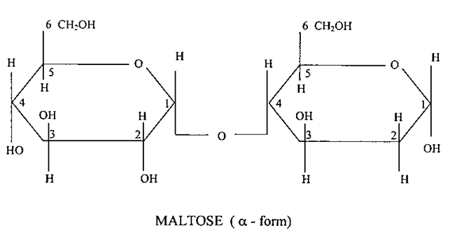 يوجد هذا السكر في الحبوب، ينحل بشكل جيد في الماء، ويتبلور في المحاليل المائية. ينتج كمركب وسطي خلال عملية تحلل النشا بواسطة أنزيم الأميليز. يتألف تركيب جزيئة المالتوز من جزيئيتين من سكر الكلوكوز، ترتبط ذرة الكربون رقم (4) في أحداهما مع المجموعة المختزلة في ذرة الكربون رقم (1) من الجزيئة الثانية مكونة سكراً مختزلاً، وكما هو في سكر اللاكتوز يتواجد المالتوز على شكلين ألفا وبيتا اعتماداً على موقع المجموعة الهيدروكيسلية المختزلة. يهضم المالتوز بسهولة، ويتعرض لفعل التخمر لاحتوائه على رابطة (a – الكليكوسيدية). الشكل التالي يوضح التركيب الكيميائي مرسوماً وفق طريقة هاورث :