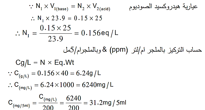 حساب عیاریة وكمیة هیدروكسید الصودیوم والتركیز بالوحدات المختلفة في محلول العینة المجهولة بأستخدام دلیل المیثیل البرتقالي والفینول نفثالین .
