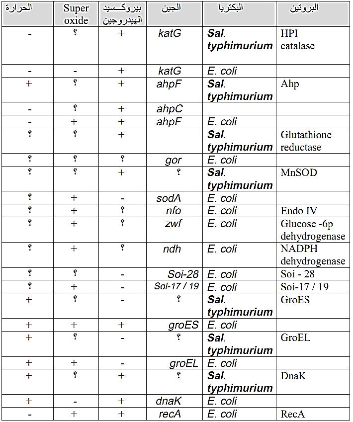 ويلاحظ ان هناك عددا من البروتينات تنتج تحت اجهاد -O2 ولا تنتج تحت اجهاد بيروكسيد الهيدروجين والعكس صحيح وربما لا يوجد بينهما تداخل والبعض منها موضح في الجدول (1)