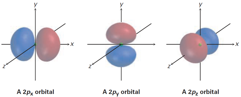 Figure 3 Shapes of the 2p orbitals. Each of the three mutually perpendicular, dumbbell shaped orbitals has two lobes separated by a node. The two lobes have different algebraic signs in the corresponding wave function, as indicated by the different colors.