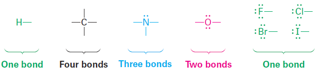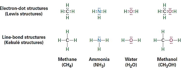 A simple way of indicating the covalent bonds in molecules is to use what are called Lewis structures, or electron-dot structures, in which the valenceshell electrons of an atom are represented as dots. Thus, hydrogen has one dot representing its 1s electron, carbon has four dots (2s2 2p2), oxygen has six dots (2s2 2p4), and so on. A stable molecule results whenever a noble-gas configuration is achieved for all the atoms—eight dots (an octet) for main-group atoms or two dots for hydrogen. Simpler still is the use of Kekulé structures, or linebond structures, in which a two-electron covalent bond is indicated as a line drawn between atoms.