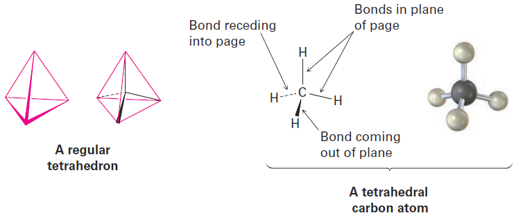 A representation of a tetrahedral carbon atom is shown in Figure 1 Note the conventions used to show three-dimensionality: solid lines represent bonds in the plane of the page, the heavy wedged line represents a bond coming out of the page toward the viewer, and the dashed line represents a bond receding back behind the page, away from the viewer. These representations will be used throughout the text.