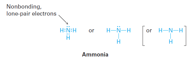 Valence electrons that are not used for bonding are called lone-pair electrons, or nonbonding electrons. The nitrogen atom in ammonia, NH3, for instance, shares six valence electrons in three covalent bonds and has its remaining two valence electrons in a nonbonding lone pair. As a time-saving shorthand, nonbonding electrons are often omitted when drawing line-bond structures, but you still have to keep them in mind since they’re often crucial in chemical reactions.