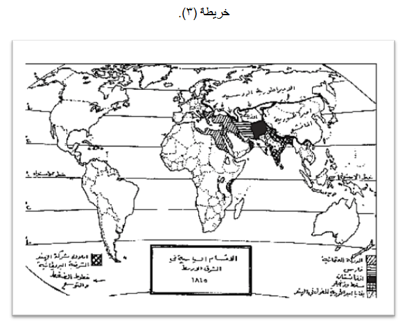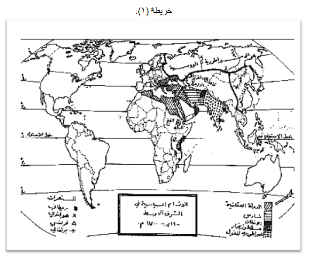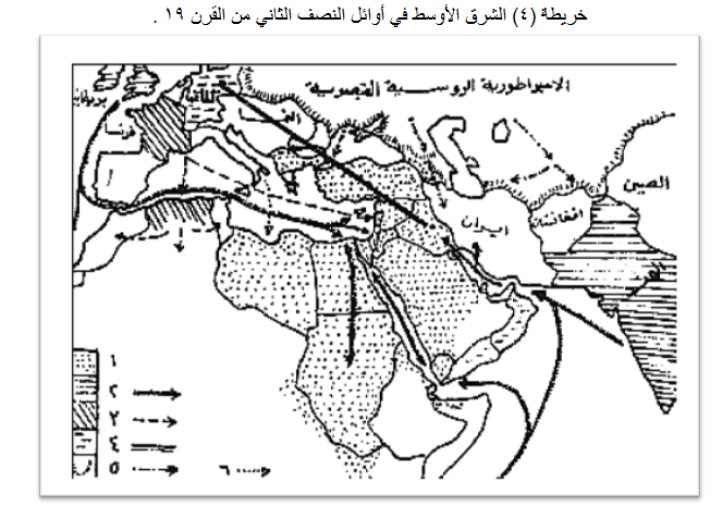 (1) الدولة العثمانية وخديوية مصر وولاية طرابلس. (2) القوى الإمبريالية البريطانية ومستعمراتها في الهند ومحمياتها في الخليج العربي وعدن، خطوط التحرك البحري صوب مصر وقناة السويس وحوض النيل والبحر الأحمر وفلسطين، ومن الهند إلى الخليج وإيران. (3) فرنسا ومستعمرتها في الجزائر، وخط تحركها صوب شرقي البحر المتوسط. (4)ألمانيا وتحركها البري إلى الشرق الأوسط عبر سكة حديد برلين بغداد.