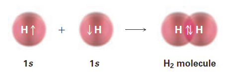 Valence bond theory is the more easily visualized of the two, so most of the descriptions we’ll use in this book derive from that approach. According to valence bond theory, a covalent bond forms when two atoms approach each other closely and a singly occupied orbital on one atom overlaps a singly occupied orbital on the other atom. The electrons are now paired in the overlapping orbitals and are attracted to the nuclei of both atoms, thus bonding the atoms together. In the H2 molecule, for instance, the H- H bond results from the overlap of two singly occupied hydrogen 1s orbitals.