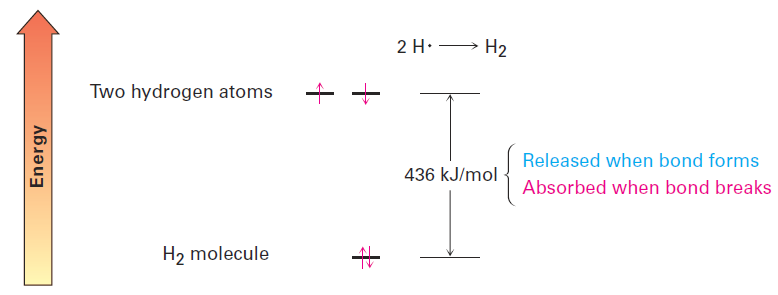 Figure 2 Relative energy levels of two H atoms and the H2 molecule. The H2 molecule has 436 kJ/mol (104 kcal/mol) less energy than the two H atoms, so 436 kJ/mol of energy is released when the H-H bond forms. Conversely, 436 kJ/mol is absorbed when the H-H bond breaks.