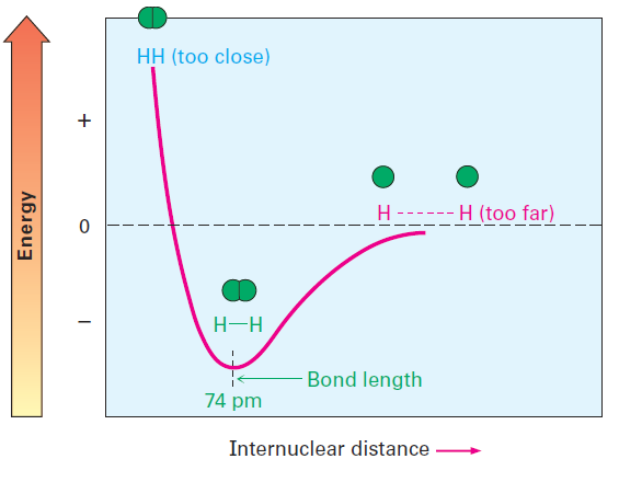 How close are the two nuclei in the H2 molecule? If they are too close, they will repel each other because both are positively charged, yet if they’re too far apart, they won’t be able to share the bonding electrons. Thus, there is an optimum distance between nuclei that leads to maximum stability (Figure 3).
