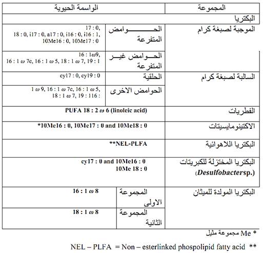جدول 1 : بعض الواسمات الحيوية من الحوامض الدهنية الموجودة في مجاميع مختلفة من الاحياء المجهرية